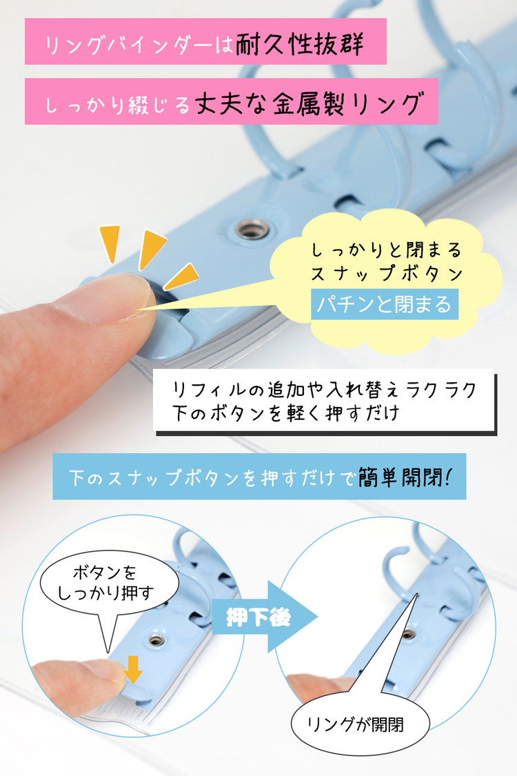 【ポイント1 使いやすいバインダー】ボタンを押すだけで穴が空くタイプなので、リフィルの入れ替えも簡単で便利です