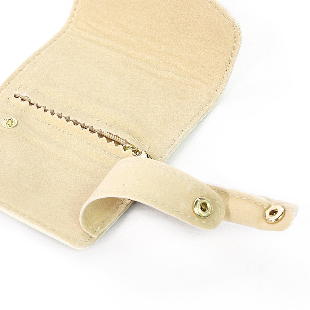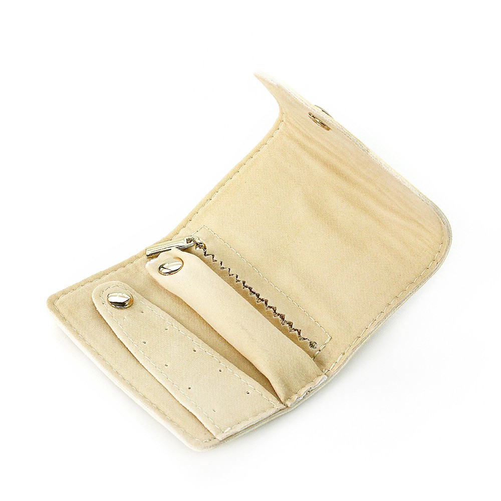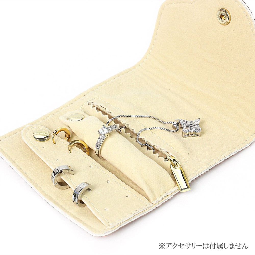 ピアスを通す穴やチャック付きのポケット、リングを挿せるクッションなど使いやすい工夫が詰まった収納ポーチです。