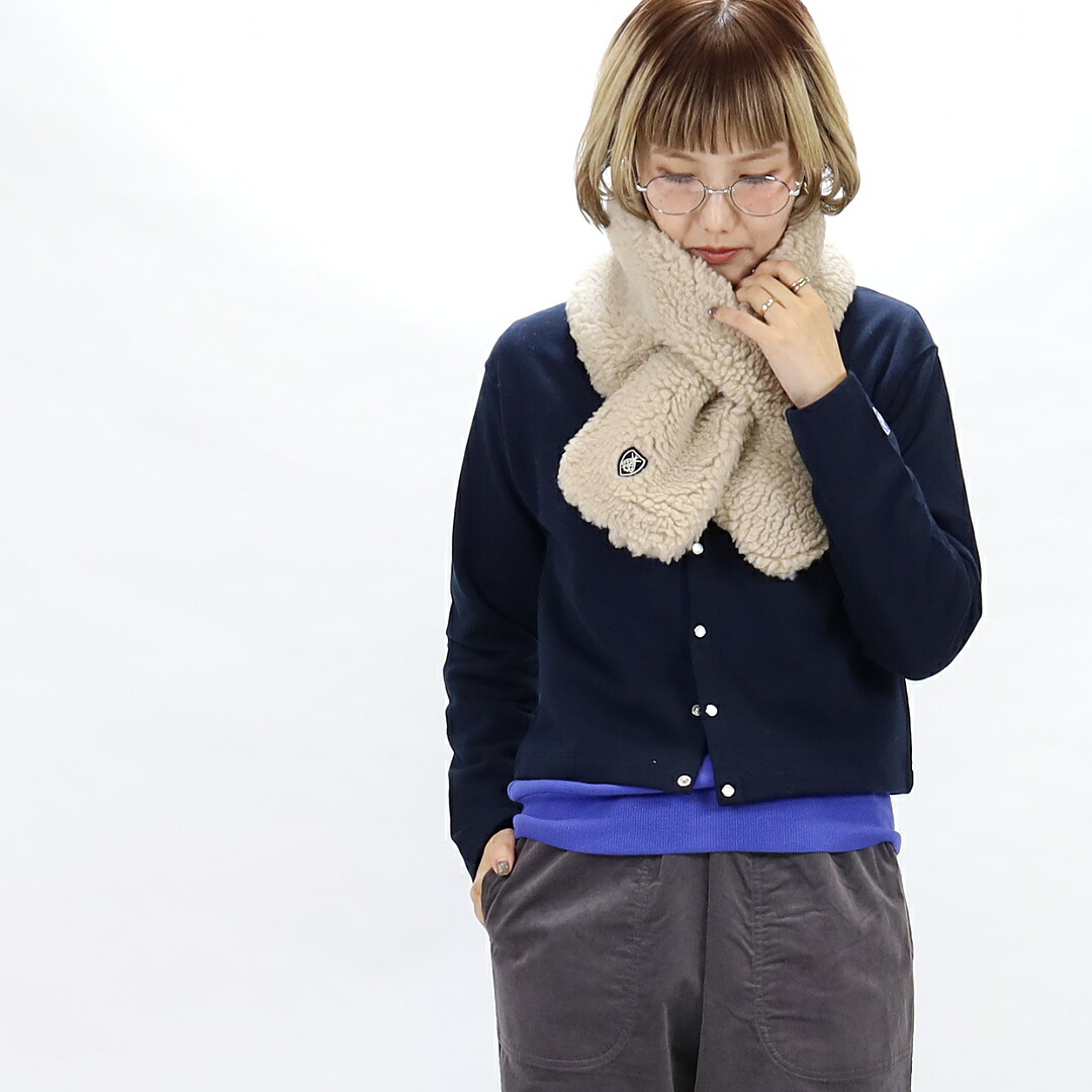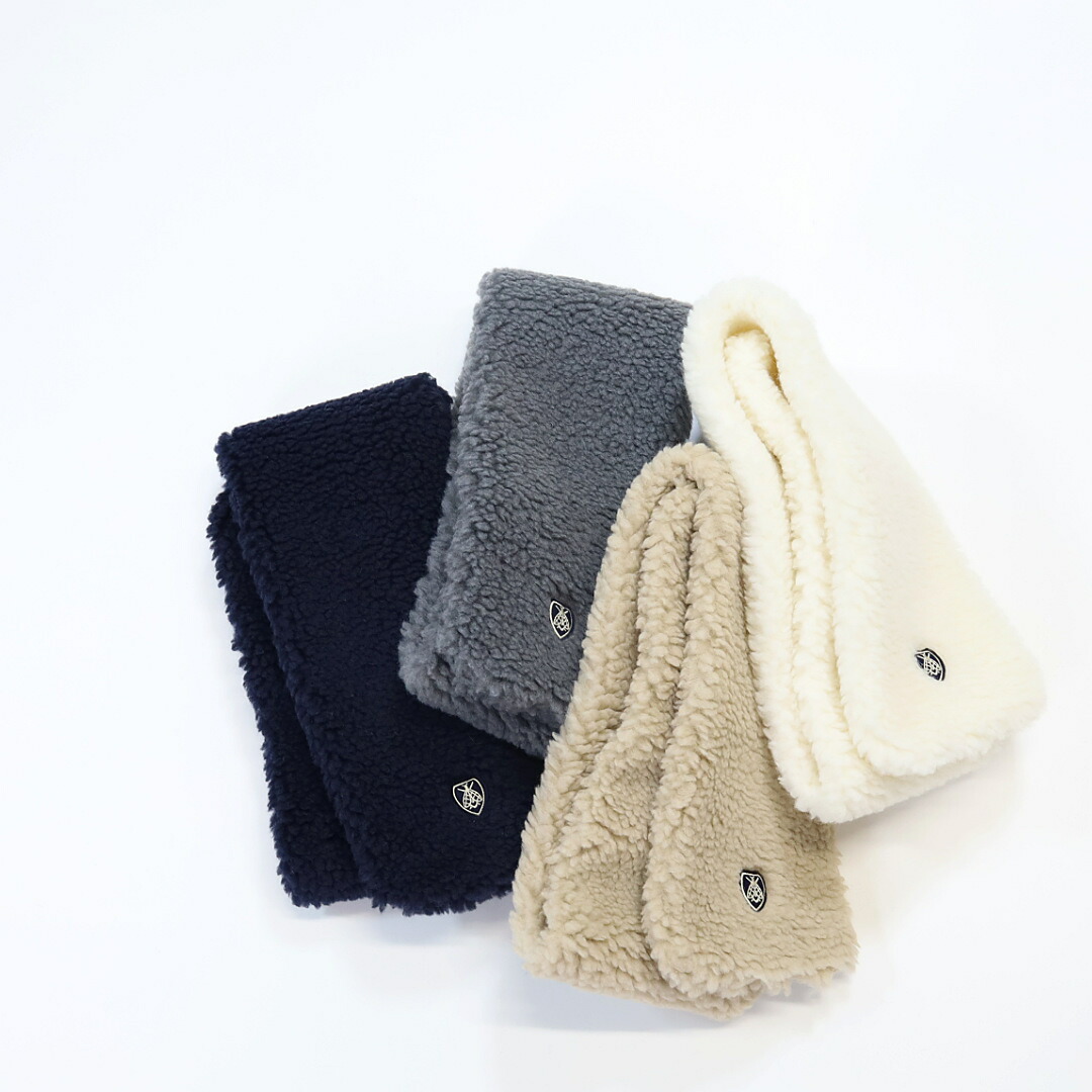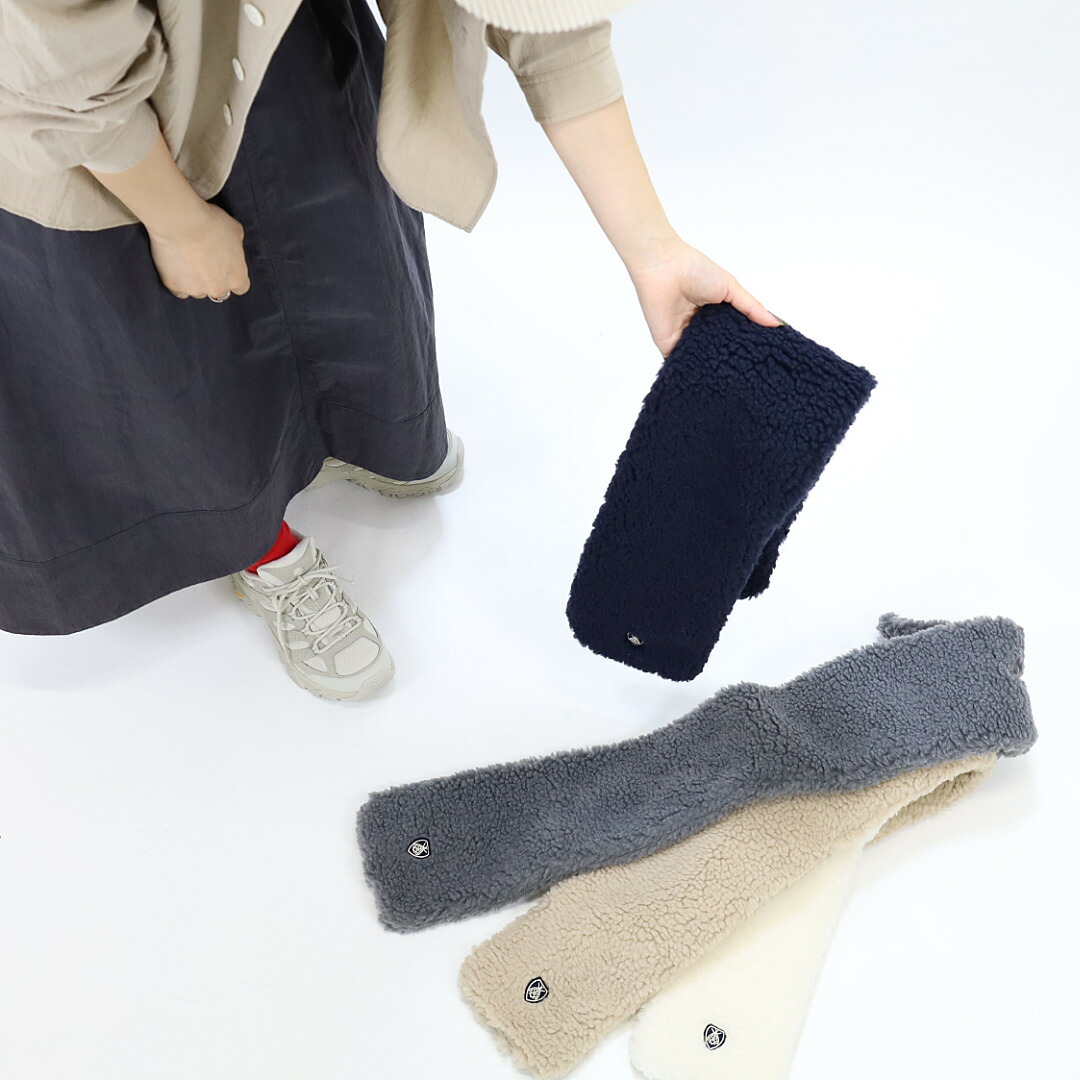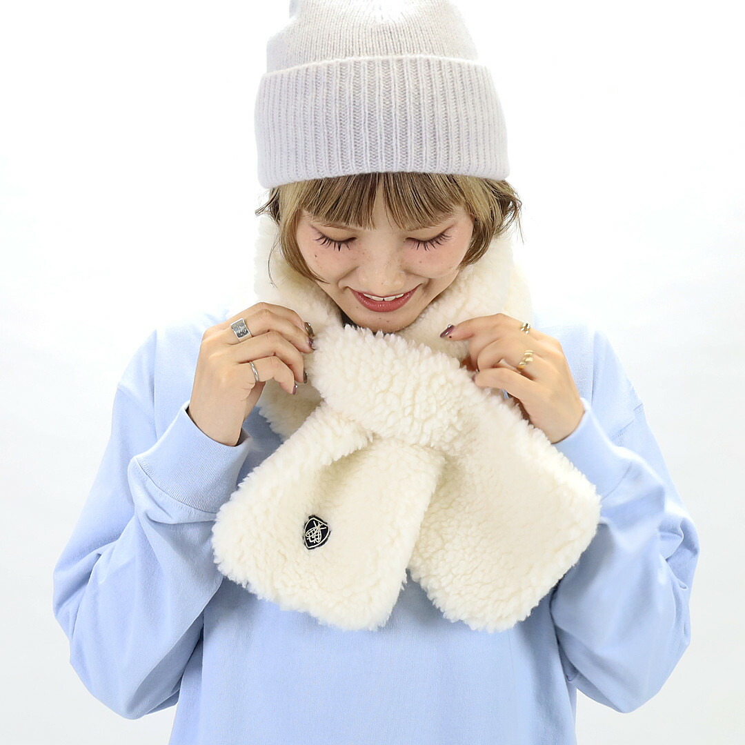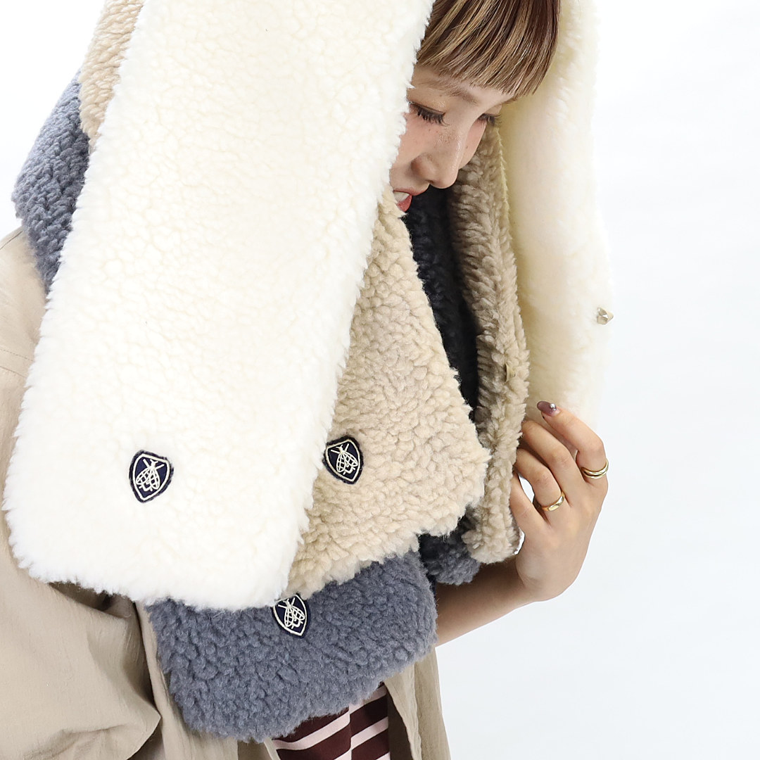 ポリエステルとウールの混紡で暖かさと、やさしい肌当たりを兼ね備えたボア素材のマフラー。