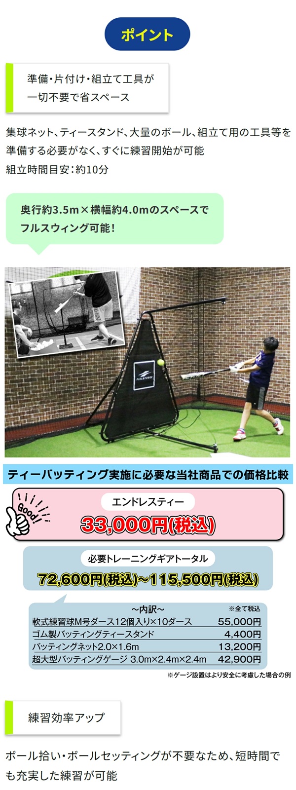 一人で黙々と振り込みたい選手、お子様のバッティングフォームをじっくり見てあげたい親御様、チームの練習効率を上げたい指導者の方に自信を持っておすすめします
