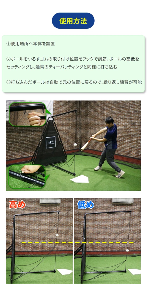 省スペース設計のため、お庭はもちろん、ガレージや室内でも練習が可能、大掛かりなバッティングネットを設置する必要がないため、準備や片付けの時間も大幅に短縮できます、部活動が終わった後の自主練習や、雨の日の室内トレーニングにも最適です
