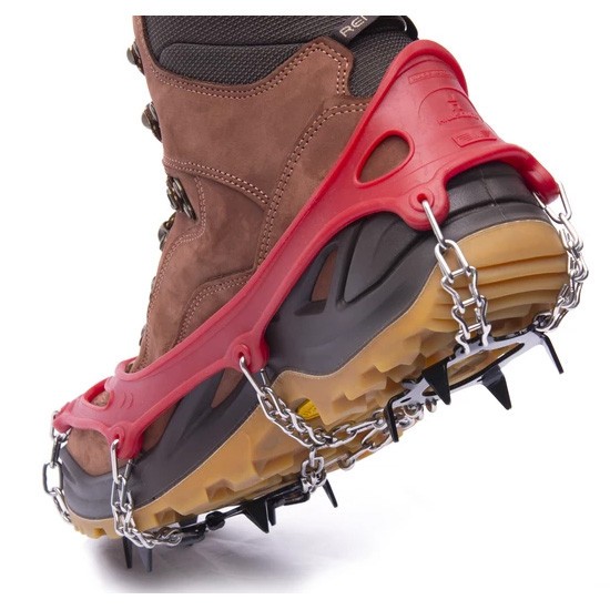 トレイルクランポンは、スパイクに炭素鋼を使用することで柔軟性と高強度を両立させた簡易アイゼンです。