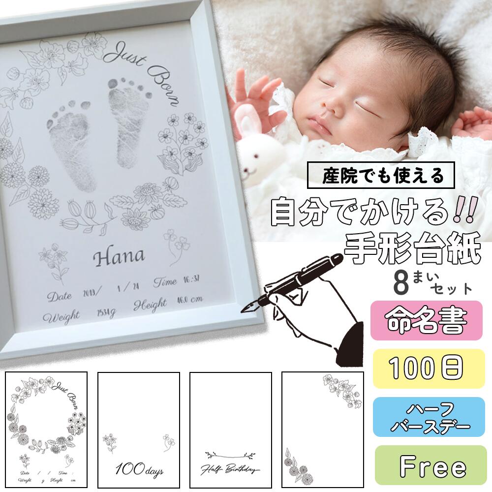 手書き 命名書 用紙のみ 手形 足形 赤ちゃん おしゃれ デザイン台紙 新生児 100日 ハーフバースデー フリー 全4種 8枚