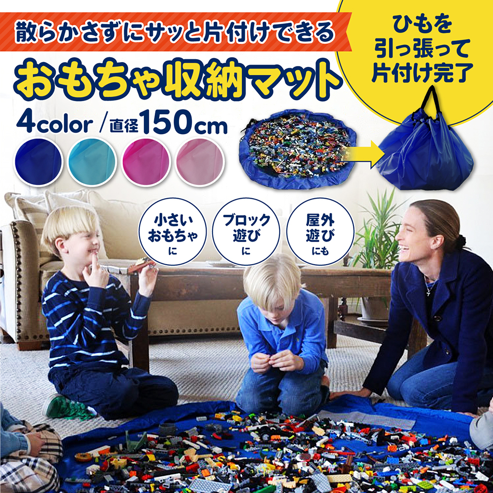 【片付け簡単】シートのようになっている収納袋です。この上で遊べて、遊び終わったあと紐をキュッと絞めるだけでお片付け完了!おもちゃ箱よりとても簡単です。特におもちゃブロック等の細かいパーツのおもちゃの片付けが快適に。