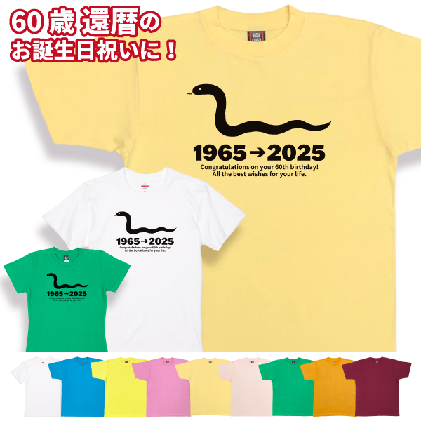 巳年 へび年 還暦 Tシャツ 2025年 干支 へび 還暦祝い 誕生日 祝い おしゃれ 女性 男性 プレゼント 60歳 メッセージ オリジナル 赤いもの 1501 1500 085