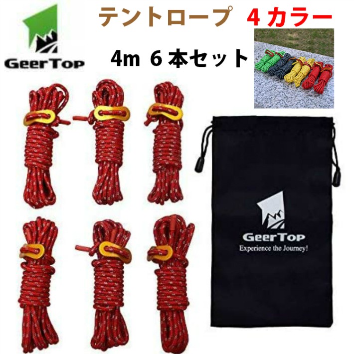 テント ロープ 反射材入り GEERTOP パラコード ガイライン ガイドロープ タープロープ アルミニウム自在金具 収納袋付き 耐荷重250kg 4mm x 4m 6本