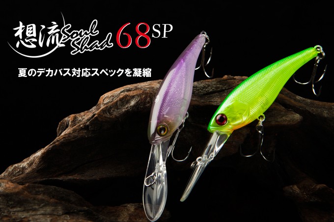 オールシーズン対応のハイポテンシャルシャッドプラグ「ソウルシャッド」シリーズにシリーズ最大モデルとなる68SPがラインナップに追加。 高度なバランス設計が抜群のスイミングアクションを実現。特に高速リトリーブでの安定感は驚くべき次元に到達しています。また、鋭く絞られたボディシェイプながら、マグネット式重心移動により安定した飛距離を約束します。アクションによるレスポンスも良く、連続トゥイッチやジャーク&ポーズに対しても確実に水を捉える為、移動距離を抑えたい鋭いアクションがターゲットを誘います。「想流」に込められた魂を体感してください。
