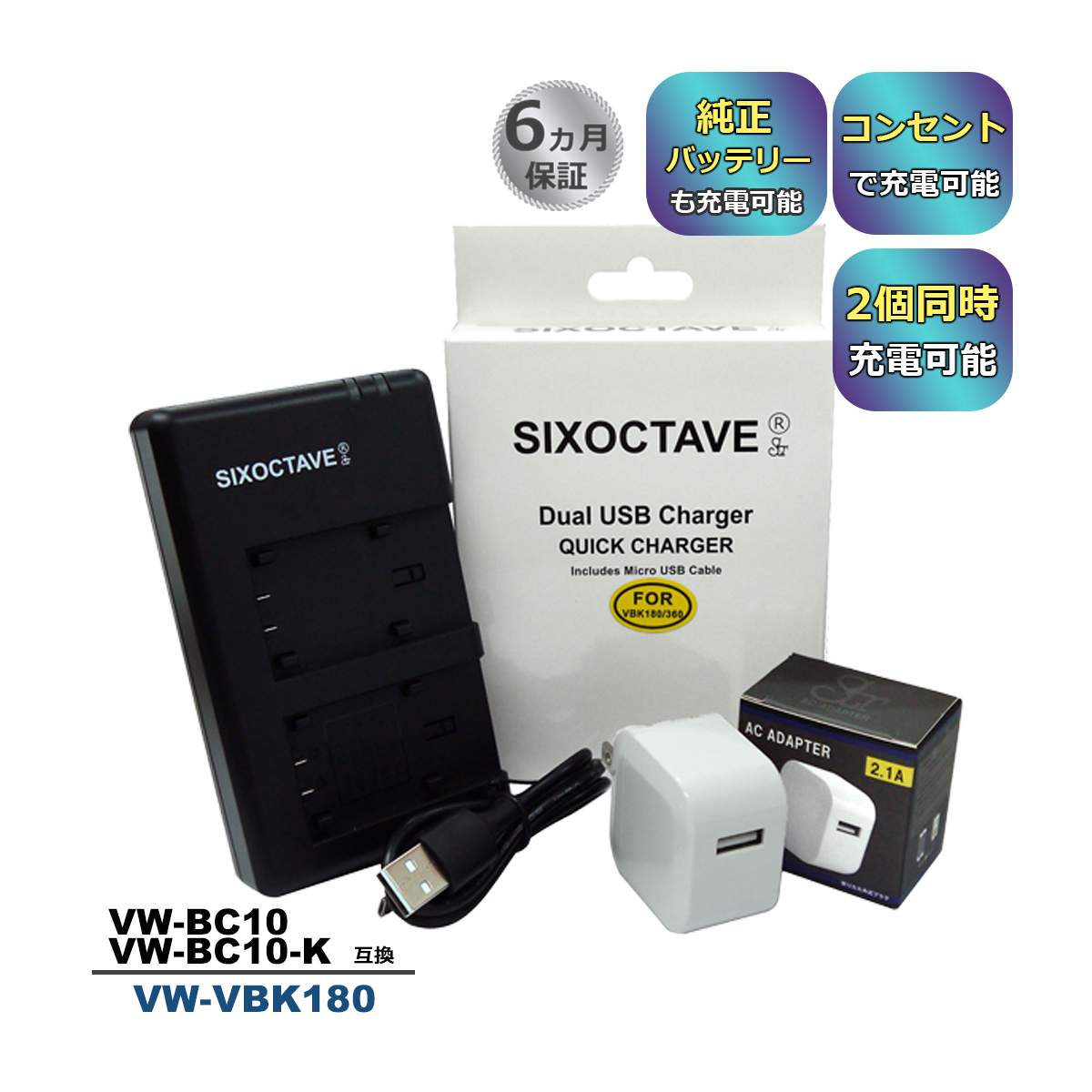 【互換品】 VW-VBK180-K VW-VBK180 Panasonic パナソニック 互換デュアルUSB充電器 コンセント充電用ACアダプター付き 2点set VW-BC10 VW-BC10-K a2.1