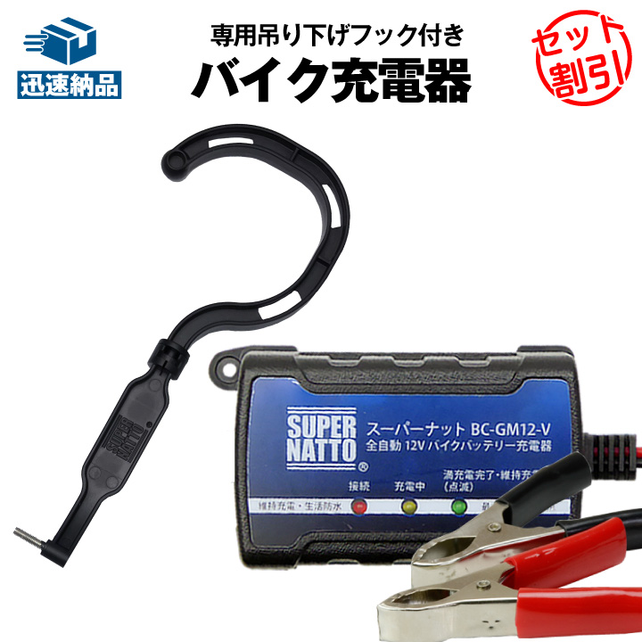 バイク バッテリー バイク充電器(チャージャー) スーパーナット充電器(12V)+専用フック セット トリクル PSE BC-GM-12-V 固定 調節 スーパーナット
