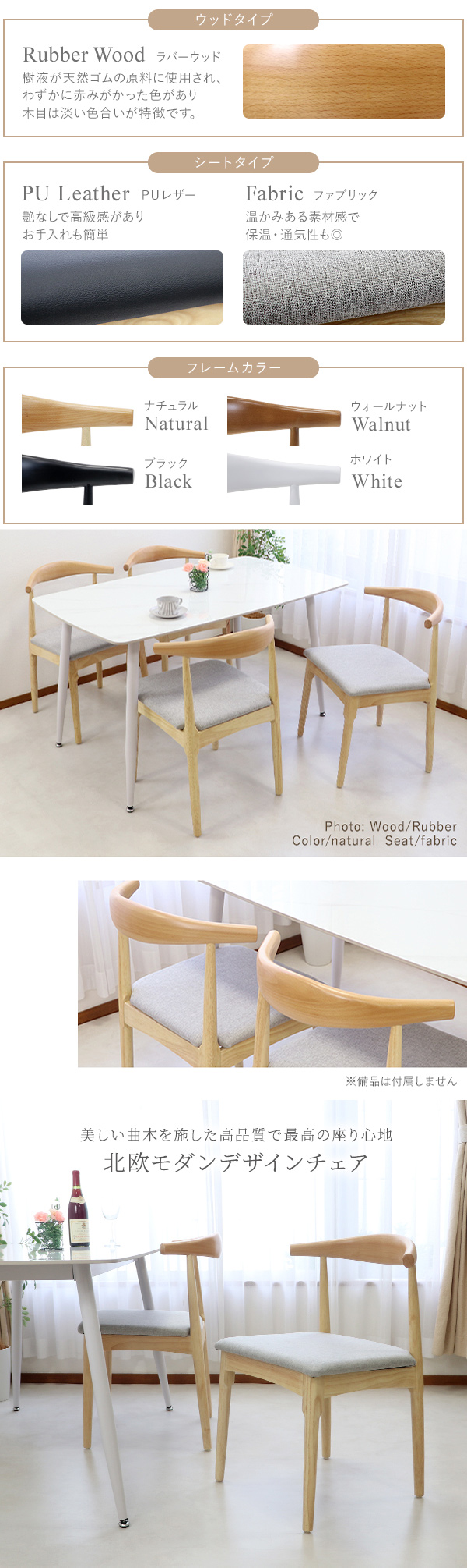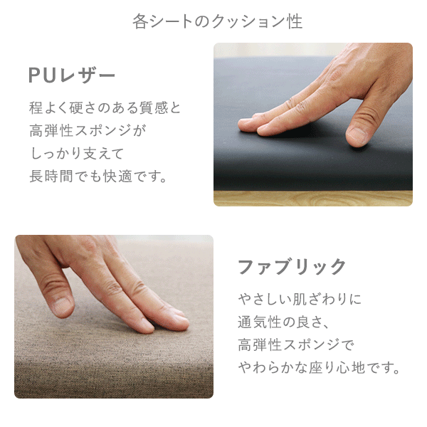 | 材質 | 〈共通〉ラバーウッド[無垢材](本体)、PVC(脚裏) 〈張り地〉PUレザー/PU(ポリウレタン)、ファブリック/リネン |