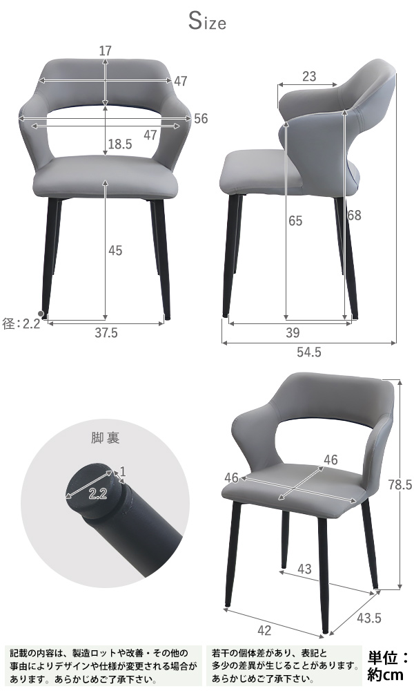 | 材質 | 炭素鋼[静電塗装](脚)、PU(ポリウレタン)(張り生地)、高弾性スポンジ(クッション)、ゴム(脚先) |