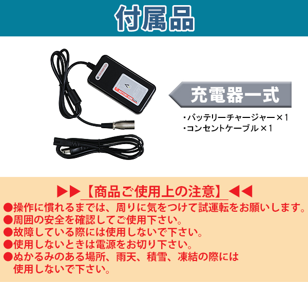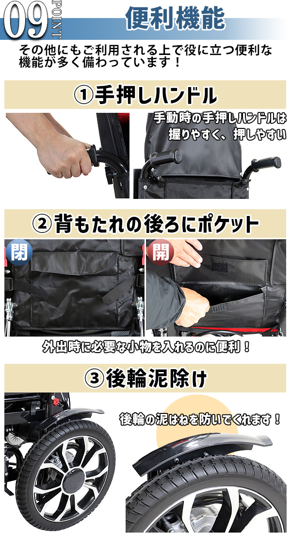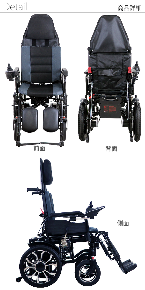 | 材質 | スチール(本体フレーム)、PU[ポリウレタン](肘掛け、前輪タイヤ、手押しハンドル)、PP[ポリプロピレン](安全ベルトバックル、足置き、転倒防止キャスター、バッテリー、泥除け、サイドガード)、ゴム(後輪タイヤ)、オックスフォード布(ヘッドサポート、シート)、鉛蓄電池(バッテリー) |