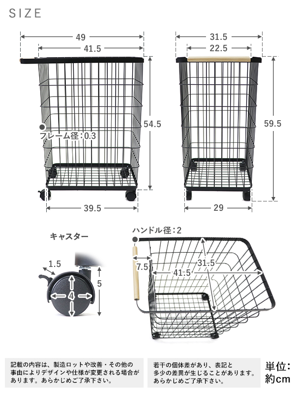 | ◇◆キャスター付き ランドリーバスケット◆◇ ■単身でも家族でも使える約55L大容量!ハイタイプののランドリーバスケットです。 ■スチールを採用しているので、耐荷重は約8kgと頑丈な構造です。 ■省スペースに設置できるスリムなデザインです。 ■スチール製の網目だから通気性がよく、湿気がこもりにくくなっています。 ■キャスター付きなので洗濯物を入れてもラクラク移動できます。 ■押し引きしやすいよう、木製ハンドルがついているので移動がスムーズです。 ■本体は約2.6kgと軽量なので、洗濯ものを2階へ運ぶなどにも、持ち運びしやすい重量となっています。 ※こちらの商品は完成品です。 ■材質:スチール[粉体塗装](本体)、松材(木製ハンドル)、PP/ポリプロピレン(キャスター)、亜鉛合金[メッキ加工](ネジ) ■重量:約2.6kg ■耐荷重:約8kg ★ご購入前の注意事項★ ★1階車上でのお渡しとなります。恐れ入りますが荷降ろし・搬入は、お客様にてお願い致します。 |