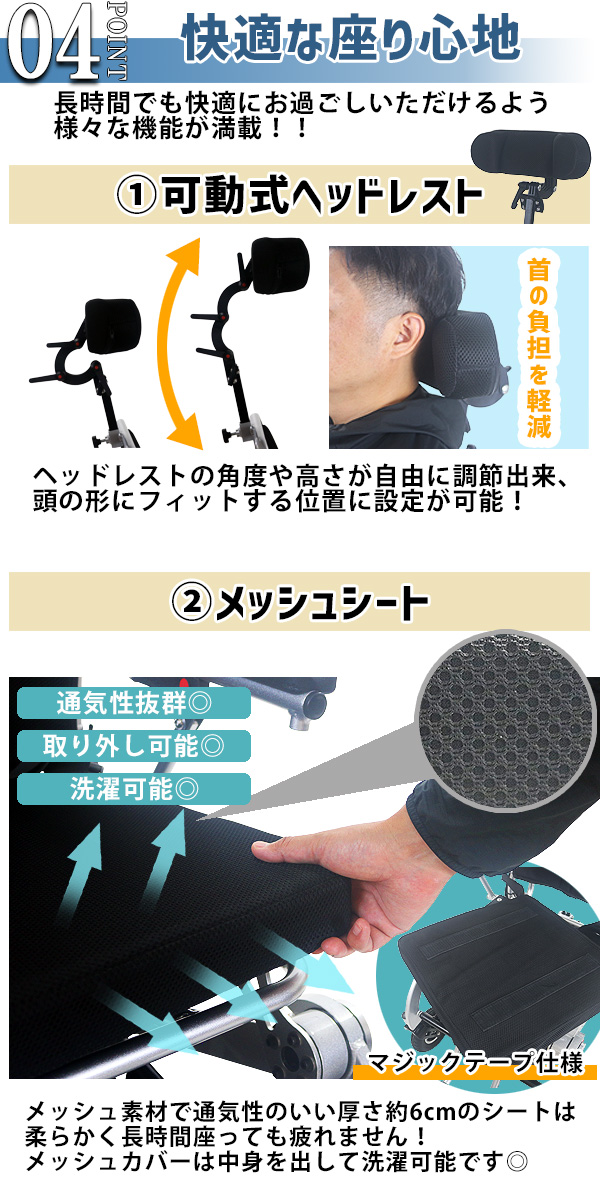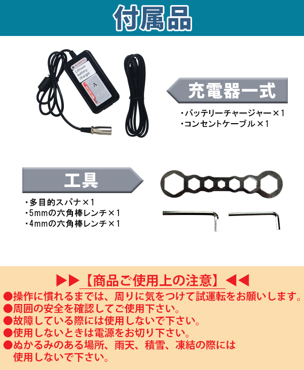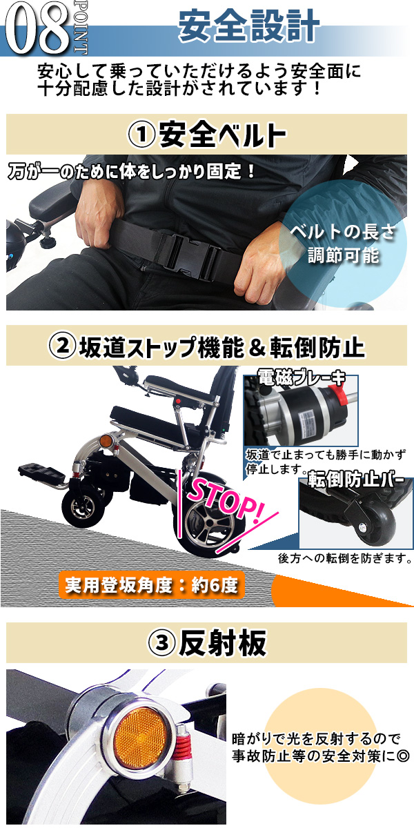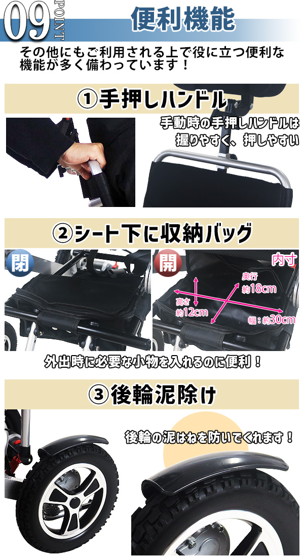 | 材質 | アルミニウム(本体フレーム)、PU[ポリウレタン](肘掛け、前輪タイヤ)、PP[ポリプロピレン](安全ベルトバックル、足置き、転倒防止キャスター、バッテリー、泥除け)、ゴム(後輪タイヤ)、オックスフォード布(ヘッドレスト、シート、小物入れバッグ)、アクリル(反射板)、リチウムバッテリー(バッテリー) |