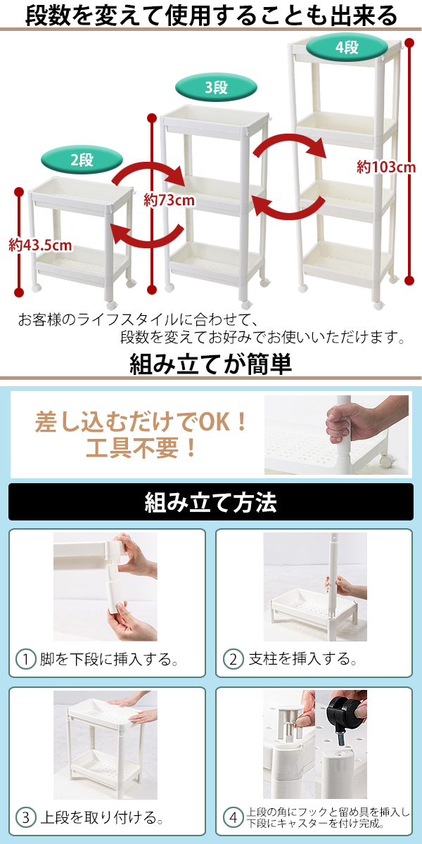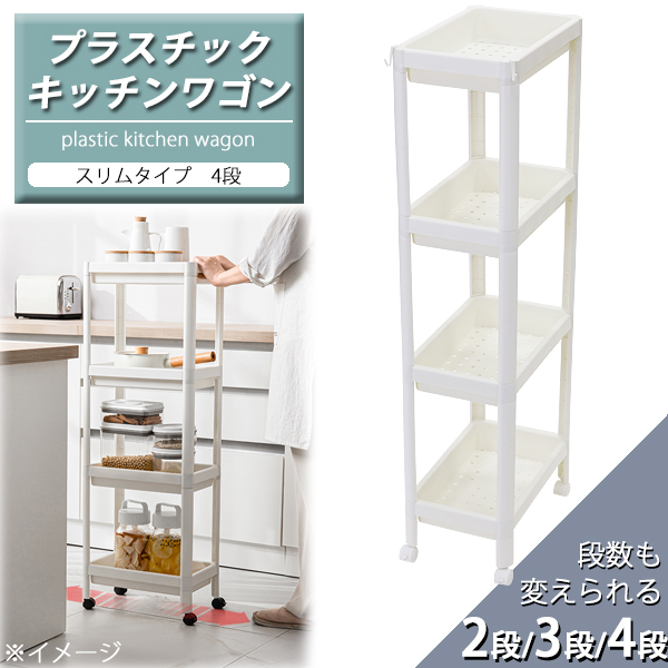 | ワゴン キッチンワゴン プラスチック キャスター 約23.5×38.5×103cm 段数変更 2段 3段 4段 スリムタイプ プラスチックワゴン テーブルワゴン 収納ワゴン 総耐荷重約48kg スリム フック 収納ラック 隙間 キッチン キッチン収納 洗面所 リビング トイレ plawagon34 | |||||