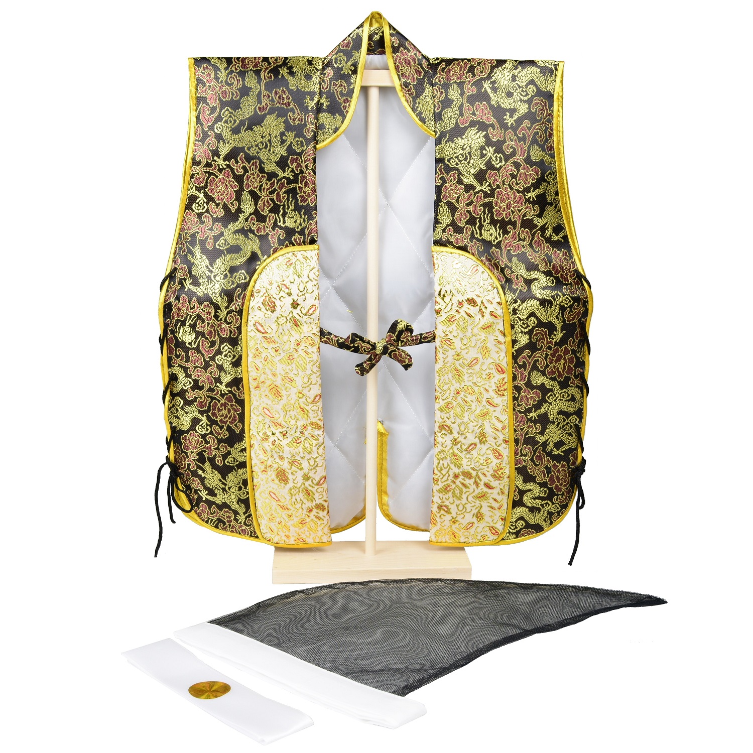 五月人形 陣羽織 金襴 龍紋様 総柄 烏帽子ハチマキ付 木製台付セット D