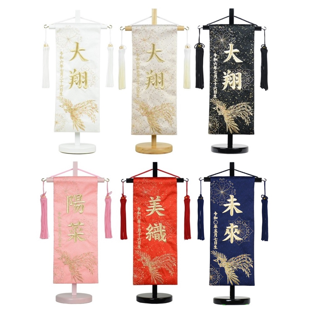 名前旗 小 刺繍 木製台付きセット 鳳凰天翔 旗サイズ29cm 命名旗 雛人形 五月人形 女の子 男の子 ミニ コンパクト