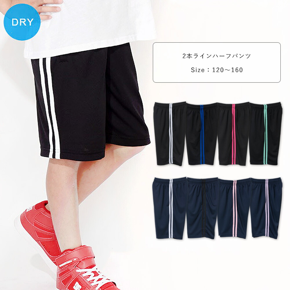 吸汗速乾 2本ラインハーフパンツ ジャージ 半ズボン パンツ キッズ ジュニア 男の子 女の子 110 120 130 140 150 160 黒/紺 110-160cm um-8981950 [BB-10]