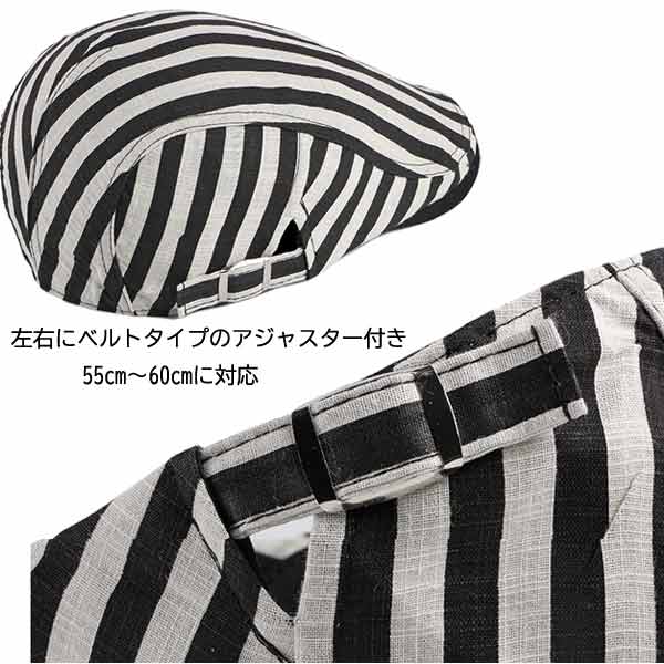 ◆ストライプ柄の薄手ハンチング帽子。◆生地に張りがあり、しわになりにくく、通気性もよく、春夏のおしゃれにおすすめです!◆サイドベルトでサイズ調整可能。