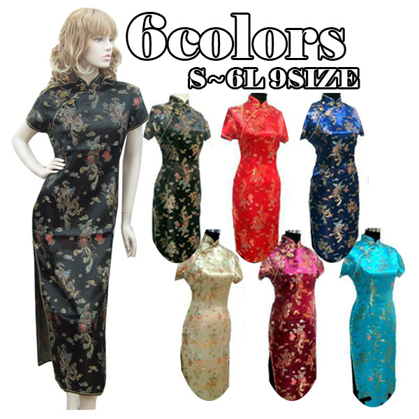 ◆龍鳳凰柄の刺繍が施されたロング丈のチャイナドレス・ロングドレス!カラーは6色、ノーマルからビッグサイズ迄に豊富な品揃え。◆光沢がある生地感がとても綺麗、普段使いから、パーティー、二次会、コスプレにもお勧め!