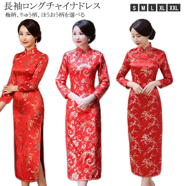 ◆上品な刺繍が施された長袖ロング丈チャイナドレス、梅柄、りゅう柄、ほうおう柄を選べる。◆光沢がある生地感がとても綺麗、普段使いから、パーティー、二次会にもお勧め!