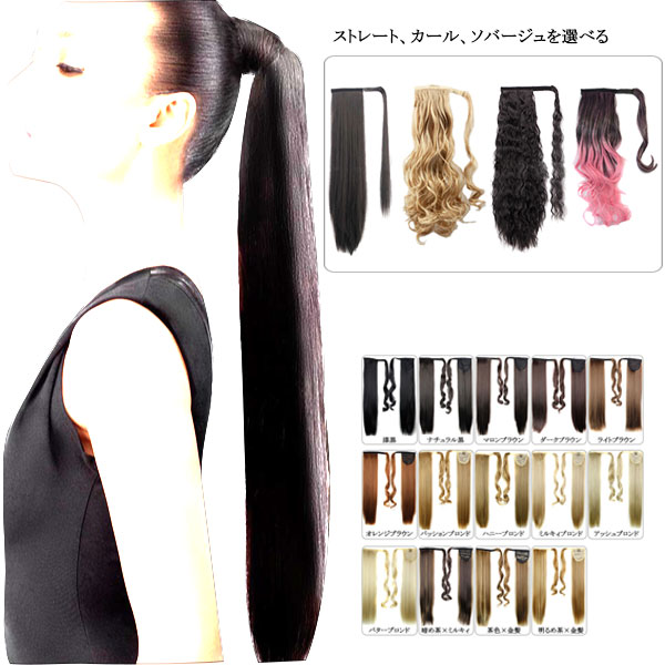◆マジックテープ付きロングポイントウィッグ、ストレート、カール、ソバージュを選べる。◆髪を束ねたら上からマジックテープで結ぶだけで簡単にポニーテールに!◆耐熱素材使用でコテ、アイロン、ドライヤーでのスタイリングができます。