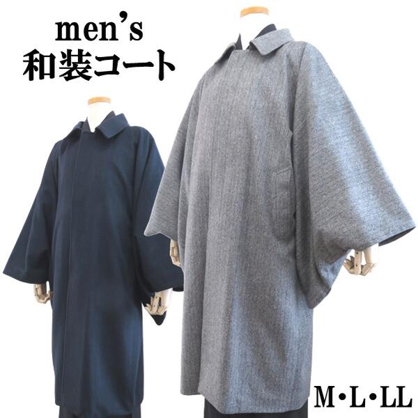 【メンズ和装コート 3553】ヘリンボーン角袖コート 日本製(2色 ネイビー・グレー)(M・L・LL)紳士 着物用コート 羽織 ロング 暖かい 防寒 ウール【YNO】