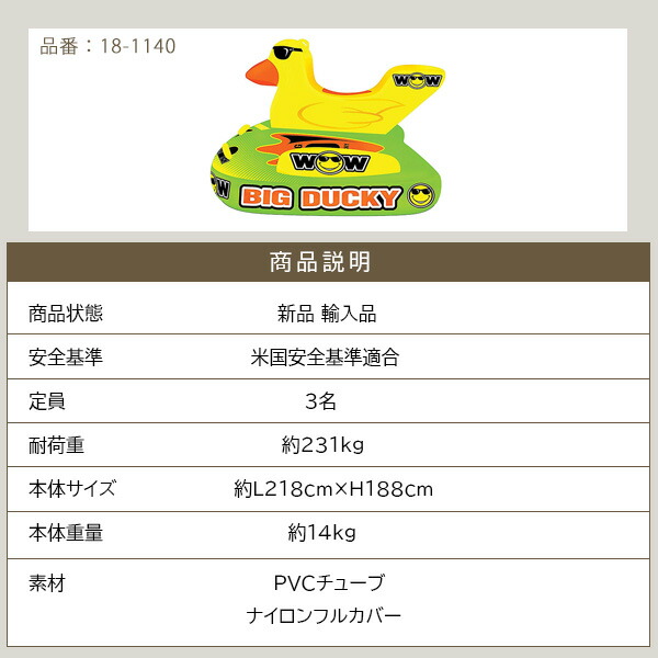 ワオ ビッグ ダッキー トーイングチューブ バナナボート 3人乗り ジェットスキー 水上バイク ボート アヒル 浮輪 浮き輪 うきわ フロート 乗り物 マリン スポーツ ウォータートイ 水遊び 海 ビーチ WOW Big Ducky