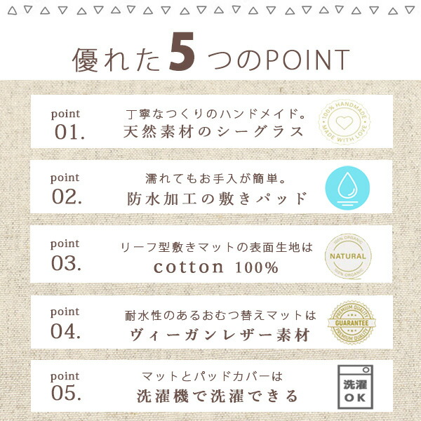 リーフ型敷きマットと敷きパッドカバーは、洗濯機で洗濯できるのでいつでも清潔に保てます