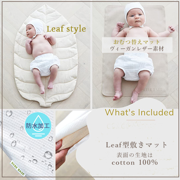 バスケット、リーフ型敷きマット、敷きパッド、おむつ替えマットの4点セット!