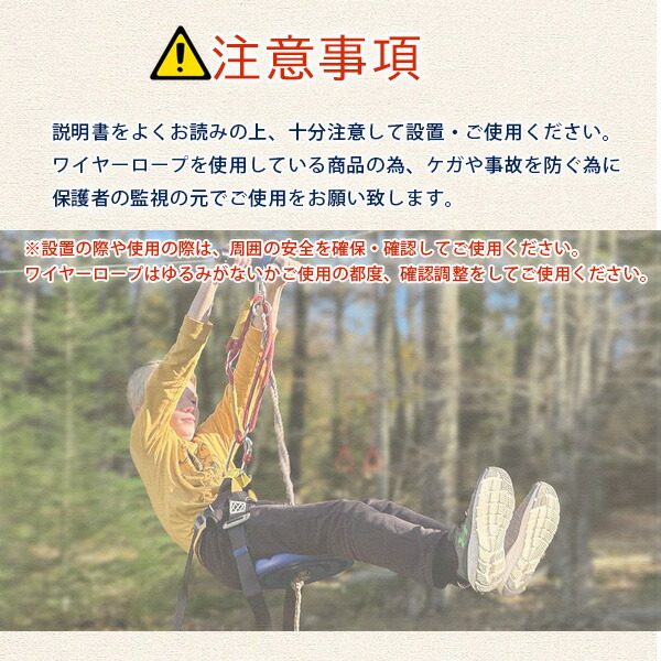 ワイヤーロープを使用している商品の為、ケガや事故を防ぐ為に保護者の監視の元でご使用をお願い致します。