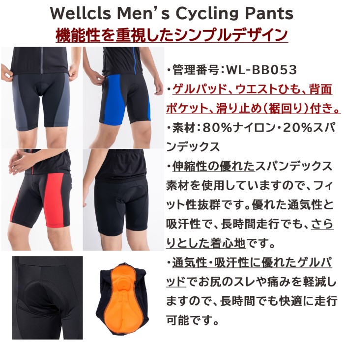 ウェルクルズ サイクルパンツ メンズ ゲルパッド付 レーサーパンツ サイクルジャージ サイクルウェア ショーツ 自転車 ロードバイク Wellcls WL-BB053