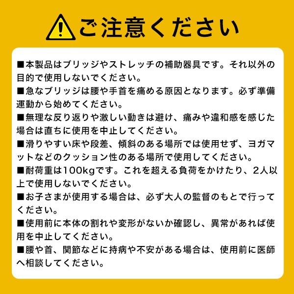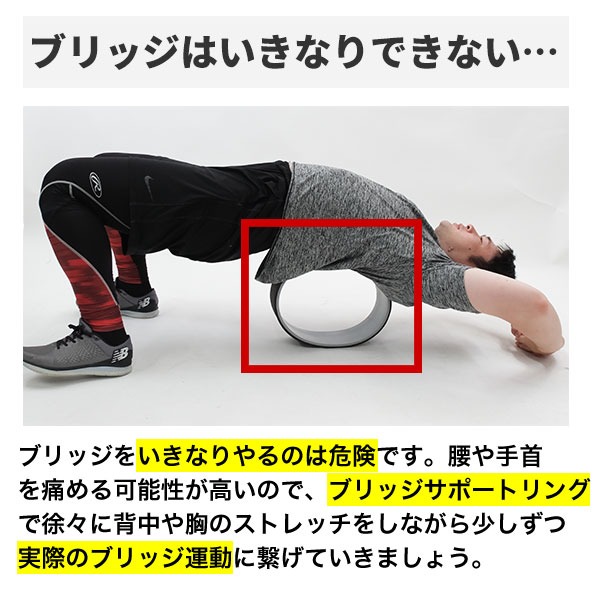 ブリッジをいきなりやるのは危険です。腰や手首を痛める可能性が高いので、ブリッジサポートリングで徐々に背中や胸のストレッチをしながら少しずつ実際のブリッジ運動に繋げていきましょう。