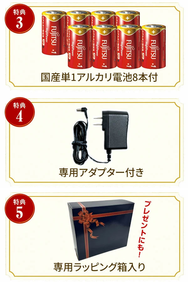 専用ACアダプターが付属し、単一アルカリ電池でも稼働。
