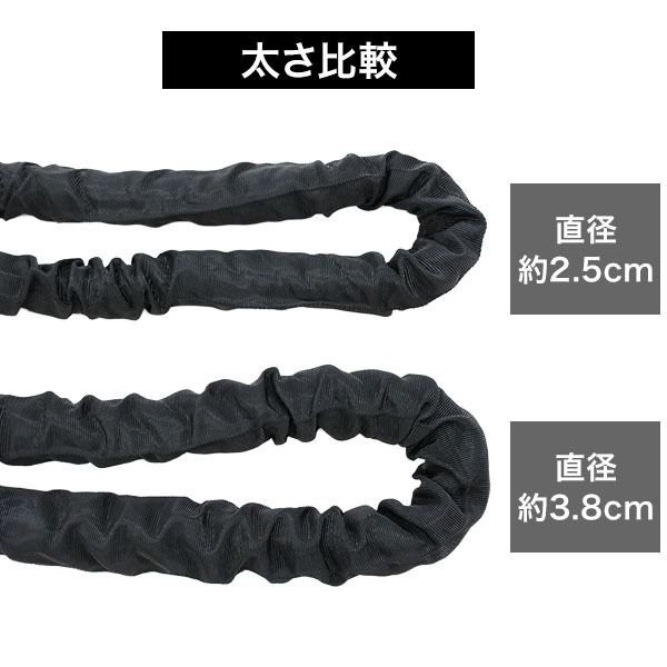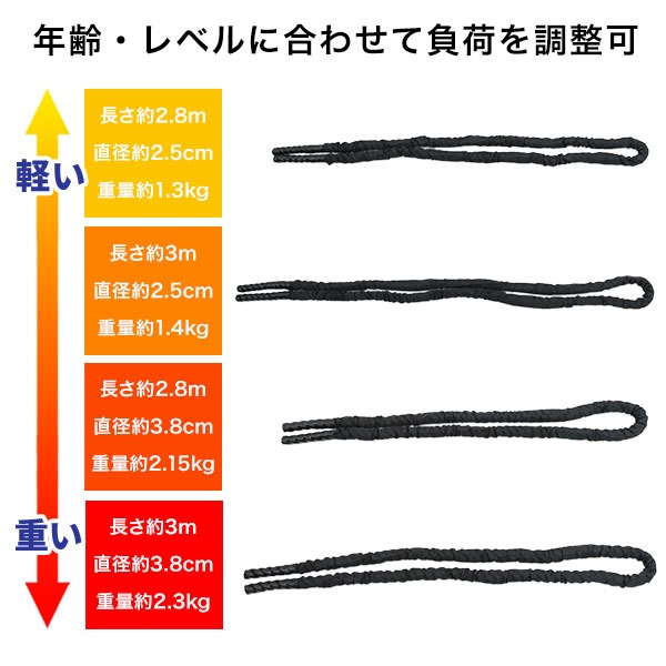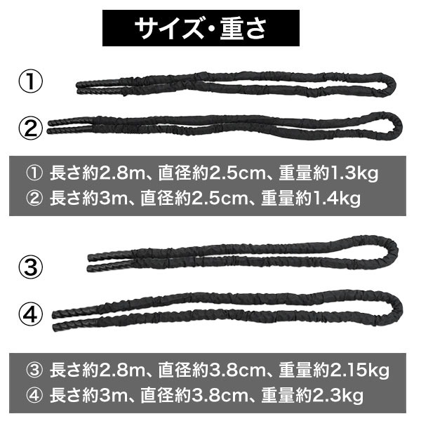 長さ約2.8〜3m、太さ2.5〜3.8cm、重さ約1.3〜2.3kgのジムロープ!
