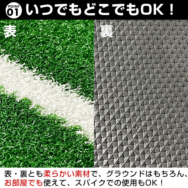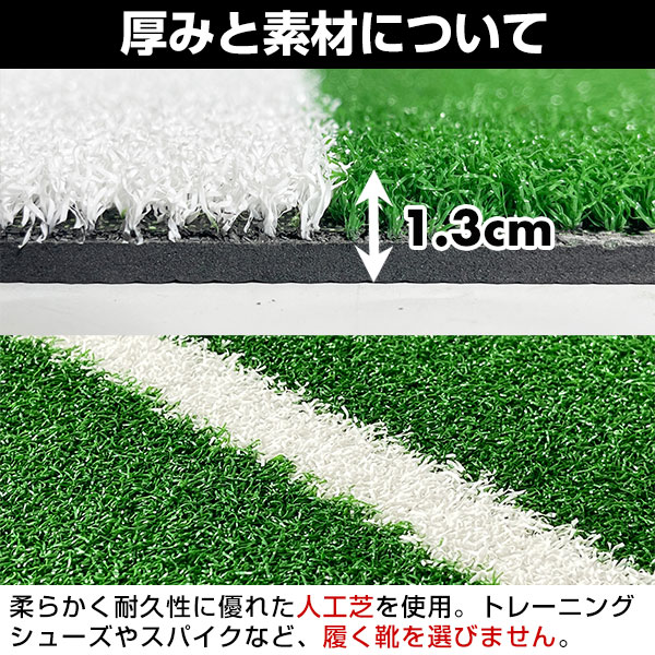 表側が人工芝+ベース(EVA素材)、裏面には5mm厚の高弾性ゴムを使用し、滑り止め効果とクッション性を両立。屋外の土・人工芝の上でもずれにくく、安心して踏み込めます。