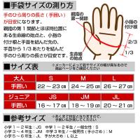 大谷選手着用のバッティンググローブからインスパイアを得たグローブ。手の平には丈夫で非常に柔らかい最高級のカブレッタシープレザーを使用。中指~小指の平側はデジタルエンボス加工を施したシープレザーを使用し、高いグリップ力、フィット性、柔らかさを発揮。シリコンプリントを施した指先はバッティングに最適なフィット感。甲側のニットメッシュと手首のバンドは吸湿速乾素材。エナメル素材のブランディングロゴ。