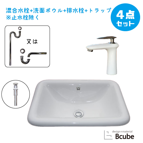 洗面台 おしゃれ セット 洗面ボウル 埋め込み型 560 交換 陶器製 大きい 大きめ 白 ホワイト リフォーム 改装 DIY 大型 4点セット 混合水栓 お洒落 綺麗 きれい 可愛い かわいい オーバーカウンター 四角型 スクエア 手洗い器 幅56cm B-0402004HJset36