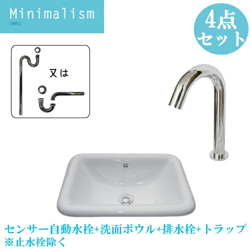 洗面ボウル 自動水栓 セット 4点 陶器 埋め込み型 おしゃれ 洗面台 センサー 蛇口 タッチレス リフォーム 洗面所 単水栓 W550 D390 H200 B-0402004HSset404