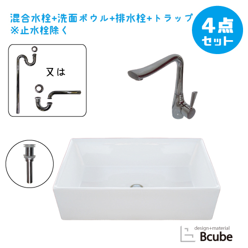 おしゃれ 洗面ボウル セット 洗面台 陶器製 大きい 大きめ 置き型 リフォーム 4点セット 混合水栓 オンカウンター 四角型 スクエア W600 D400 H160 B-0402035HJset45