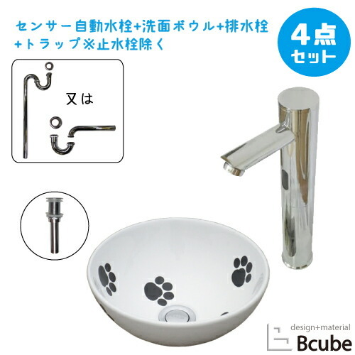 陶器 洗面ボウル 手洗い器 洗面台 おしゃれ 4点 セット 猫 足跡 置き型 小さい 小さめ コンパクト センサー自動水栓 タッチレス 交換 単水栓 W280 B-0405076HSset265