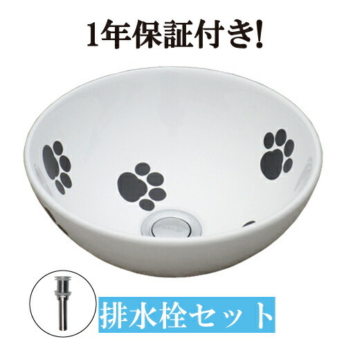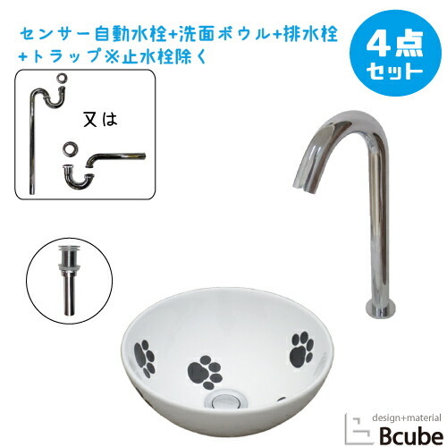 猫 足跡 手洗い器 洗面ボウル セット 4点 置き型 陶器 小さい 小さめ コンパクト 洗面台 おしゃれ タッチレス リフォーム 単水栓 直径280 H120 mm B-0405076HSset407