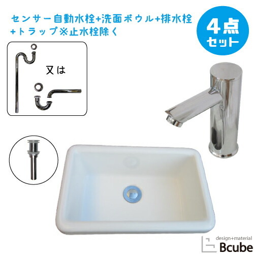 洗面ボウルと水栓セットの解説洗面ボウルや蛇口(水栓)、排水栓、トラップをセットにした3〜4点セット!