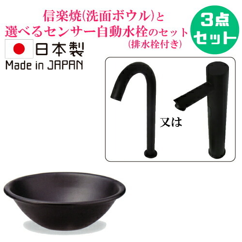 手洗い鉢 信楽焼 洗面ボウル 3点セット 置き型 小さい 小さめ コンパクト センサー自動水栓 陶器 おしゃれ タッチレス リフォーム 単水栓 W360 B-8180(A041-01)HJset45