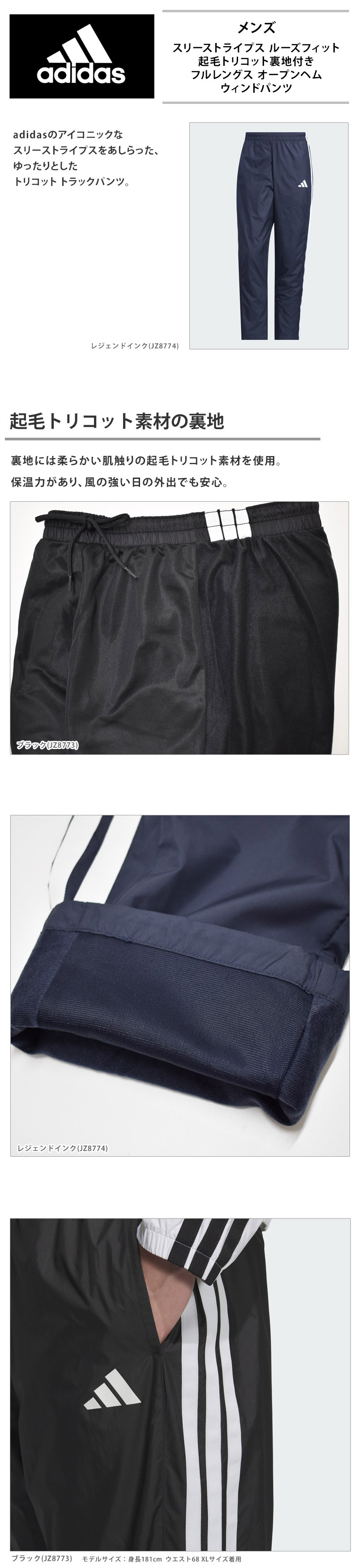 SALE メンズ ボトムス adidas アディダス スリーストライプス ルーズフィット 起毛トリコット裏地付きフルレングスオープンヘムウィンドパンツ QD767 送料無料