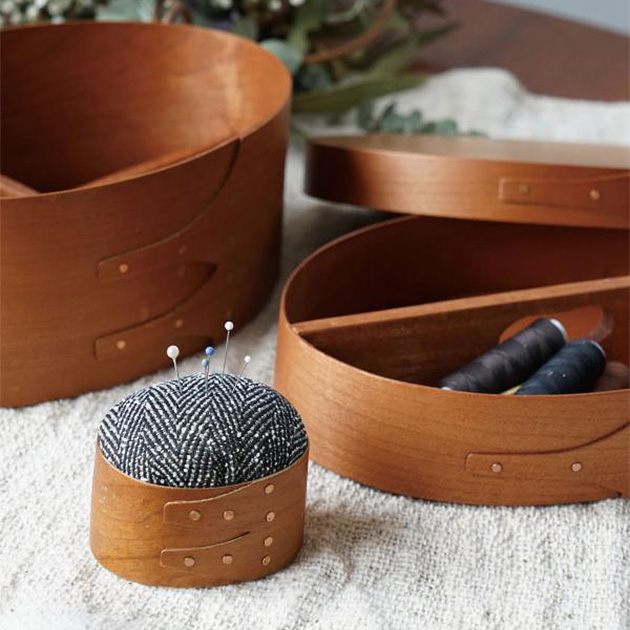 暖かみのあるチェリー材と、チェリー材の色に合わせてセレクトしたファブリックのピンクッションは、日常の作業をちょっだけ楽しい時間にしてくれそうです。