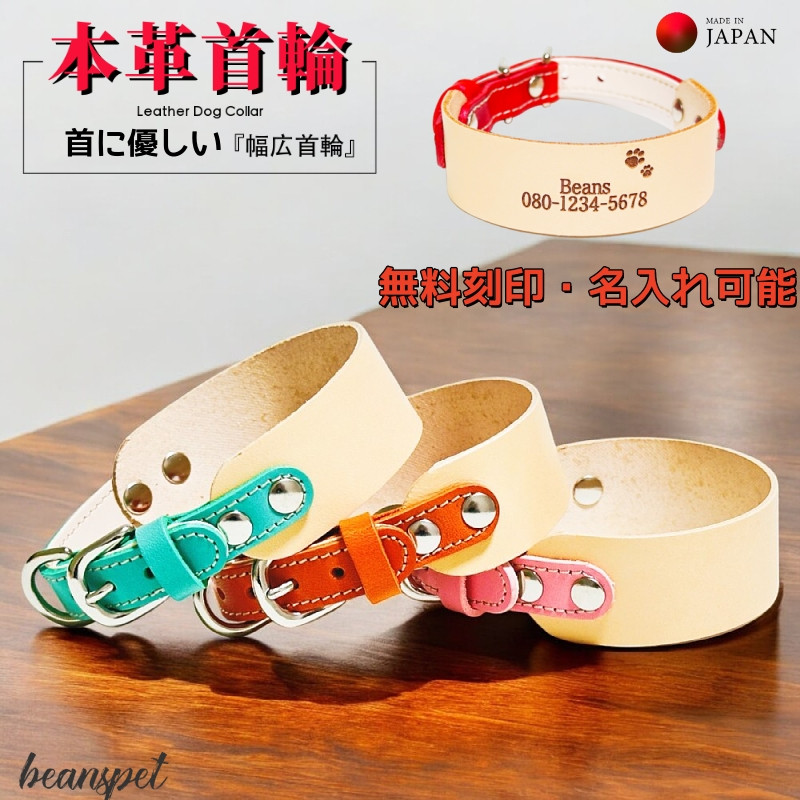名入れ無料 犬用首輪 本革 幅広 日本製 首に優しい 小型犬向け 牛ヌメ革 ベルトタイプ 調整可能 軽量 おしゃれ XS・S 全7色