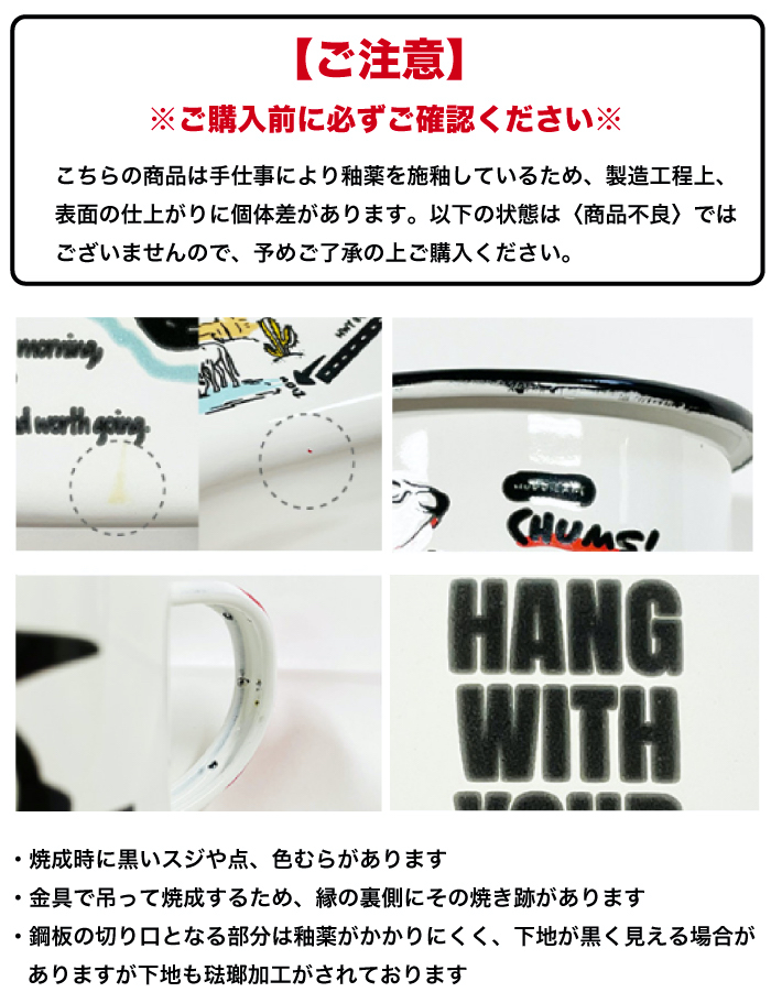 | 【製品について】 ※こちらの商品は手仕事により釉薬を施釉しているため、製造工程上、表面の仕上がりに個体差があります。 以下の状態は〈商品不良〉ではございませんので、予めご了承の上ご購入ください。 ・焼成時に黒いスジや点、色むらがあります ・金具で吊って焼成するため、縁の裏側にその焼き跡があります ・鋼板の切り口となる部分は釉薬がかかりにくく、下地が黒く見える場合がありますが下地も琺瑯加工がされております |