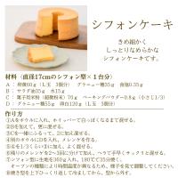 | 【ふわふわシフォンケーキの作り方】 材料 直径17cmのシフォン型×1台分 A 卵黄 95g(L玉 5個分) A グラニュー糖 50g A 食塩 0.5g B サラダ油 50g B 水 20g C 菓子用米粉(超微粉末)100g C ベーキングパウダー 1.2g(小さじ1/2) D グラニュー糖 80g D 卵白 190g(L玉 5個分) 作り方 1.Aをボウルに入れ、 ホイッパーで白っぽくなるまで混ぜる。 2.AにBを加えて、更に混ぜる。 3.Cを一緒にふるって、Bに加え混ぜる。 4.別のボウルにDを入れ、メレンゲを作る。 卵白、ボウルともに冷えたものを使う。 5.木ヘラかゴムべらを使い、 Dの1/3くらいをCに加え、よく混ぜる。 残りのメレンゲを2〜3回に分けて加え、 手早くサックリと混ぜる。 6.シフォン型に生地を360g入れ、 180℃で35分焼く。 ※オーブンの種類により、時間、 温度が異なるため、 様子を見て調整してください。 7.焼き型を上下ひっくり返して 冷ましてから、型から外す。 |