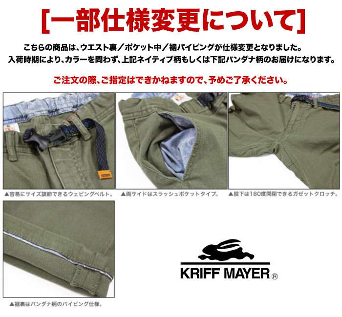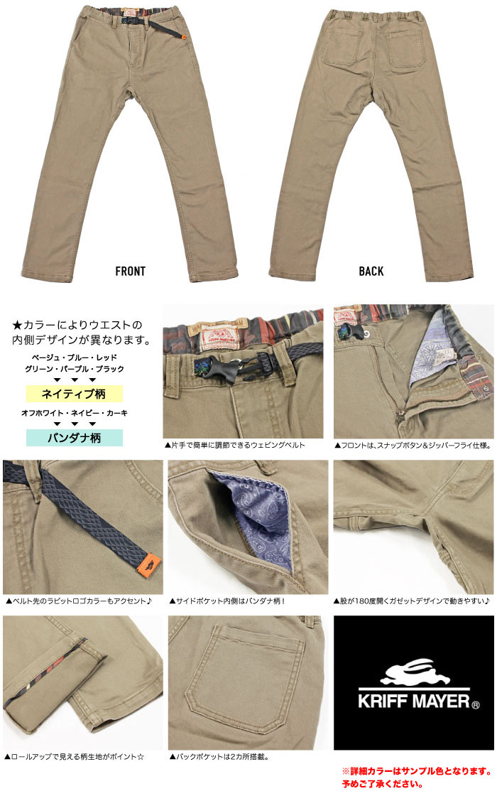 | 【仕様変更について】 こちらの商品は仕様変更により、ウエストベルト裏、ポケット中、裾パイピング柄が、「ネイティブ柄」または「バンダナ柄」どちらかのお届けとなります。 ご注文の際、ご指定はできませんので、予めご了承ください。 商品の形、サイズ、素材、カラーなど、ベルト柄以外の変更はございませんので、商品自体は同じものとなります。 |